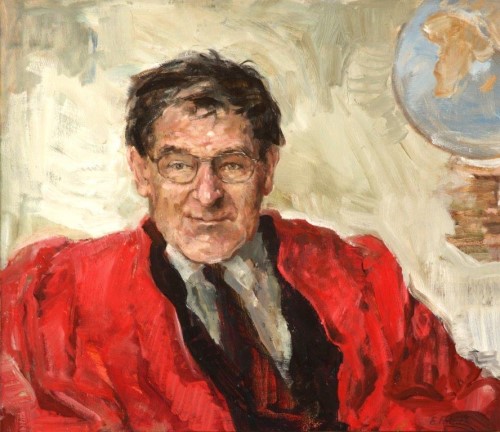 He was proud of the global aspect of his work and so, when trying to avoid a dull interior background, I was relieved to have the idea that a suggestion of a globe could be appropriate. I remember commenting how dull I find men's suits and so he offered to wear the red gown for the second sitting. The last sitting was very good for making the painting stronger. His character was so consistent that everything was just reinforced. I like the strength of this portrait.