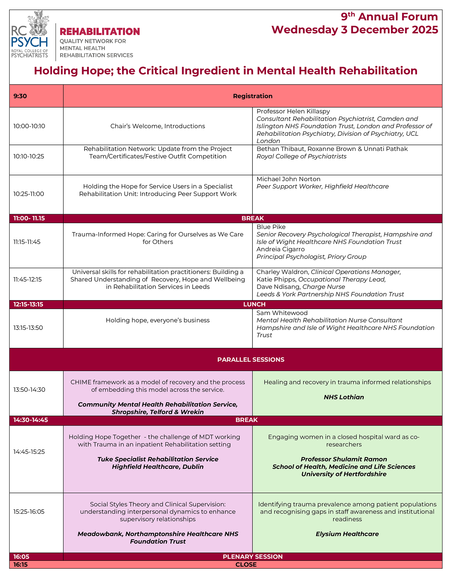 The 9th Rehabilitation Annual Forum took place in person on Wednesday 3 December 2025 9.30am - 4.30pm. It was a full day event with presentations from a range of experts within rehabilitation mental health services on the theme of 'Holding Hope: The Critical Ingredient in Mental Health Rehabilitation'.
