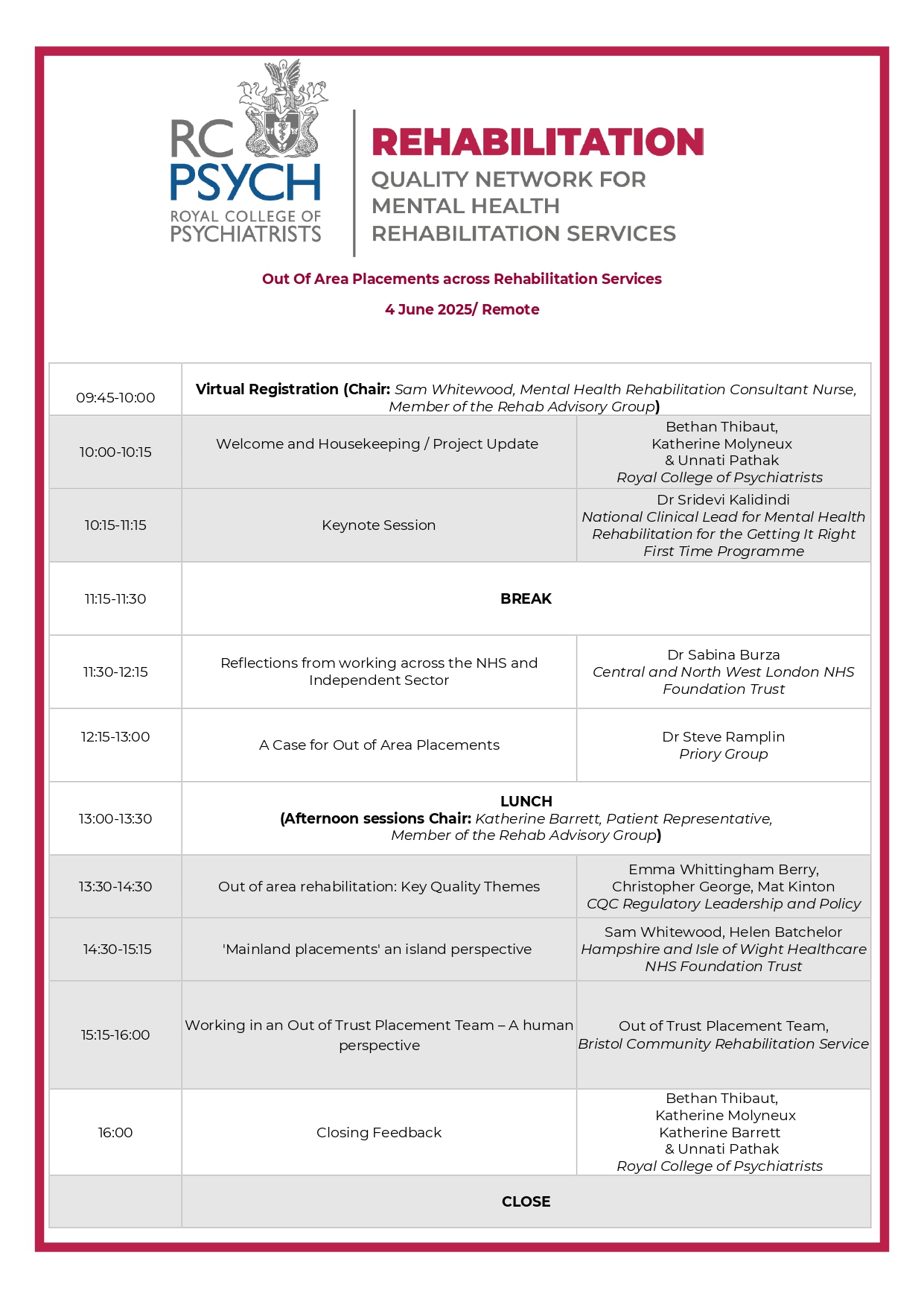 The Quality Network for Rehabilitation Mental Health Services hosted a webinar, focusing on out of area placements across rehabilitation settings on Wednesday 4 June 2025 10am-3pm.