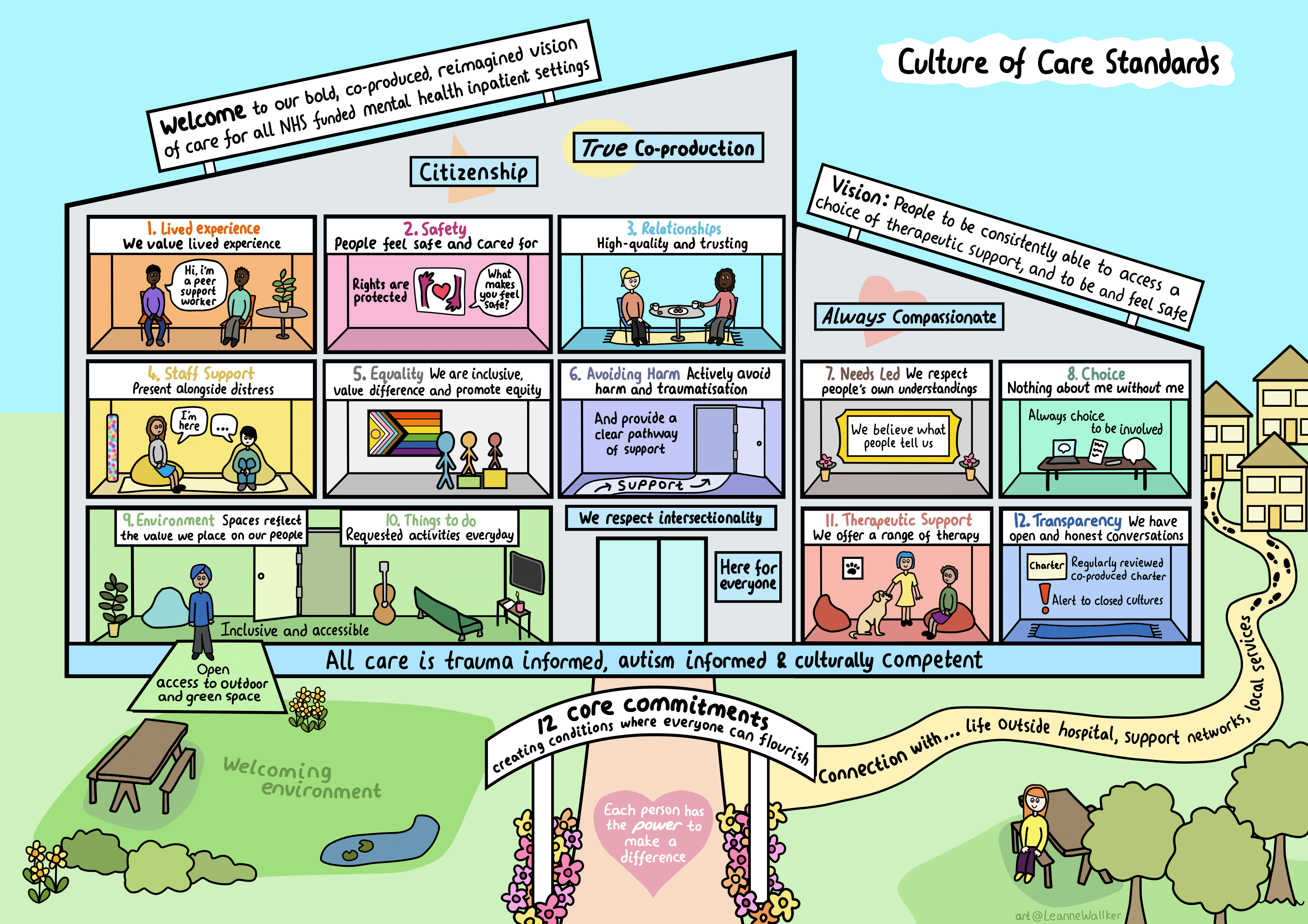 In 2023, NHS England convened a group with strong representation from the sector, lived experience leadership and involvement, and people who experience inequality in accessing and using mental health services, to develop a set of Culture of Care standards that describe in detail what this means. These standards form the bedrock of the programme and underpin all of our design and delivery.