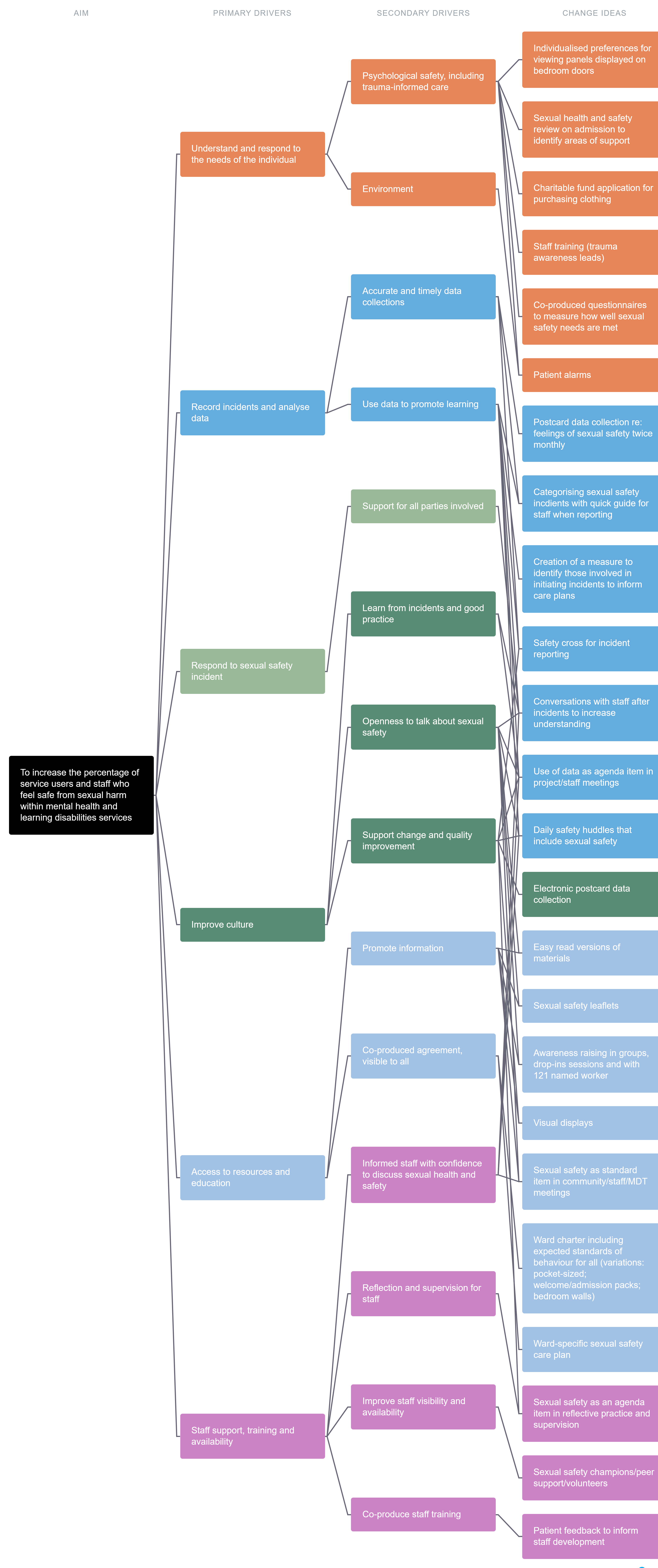 We created an interim change theory (driver diagram) based on a range of change ideas being tested across the collaborative in November 2020. Details of the change ideas are listed under the secondary drivers below.