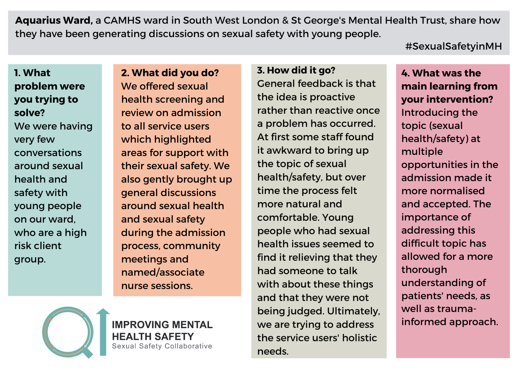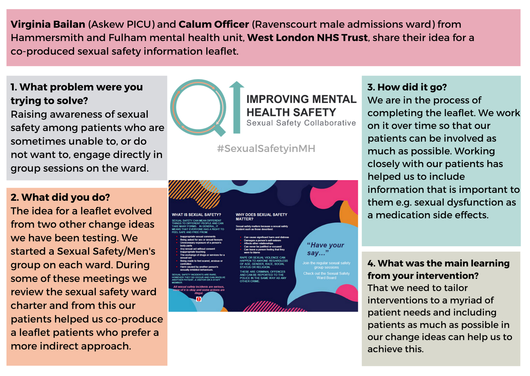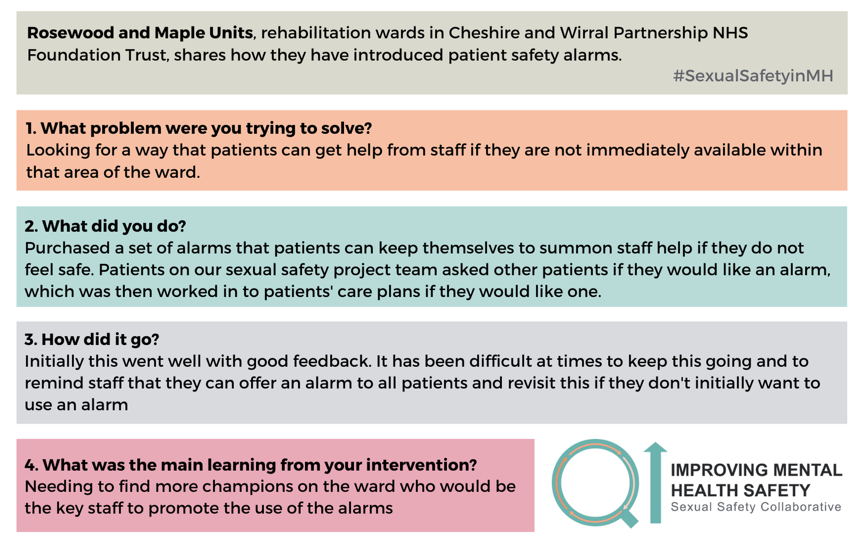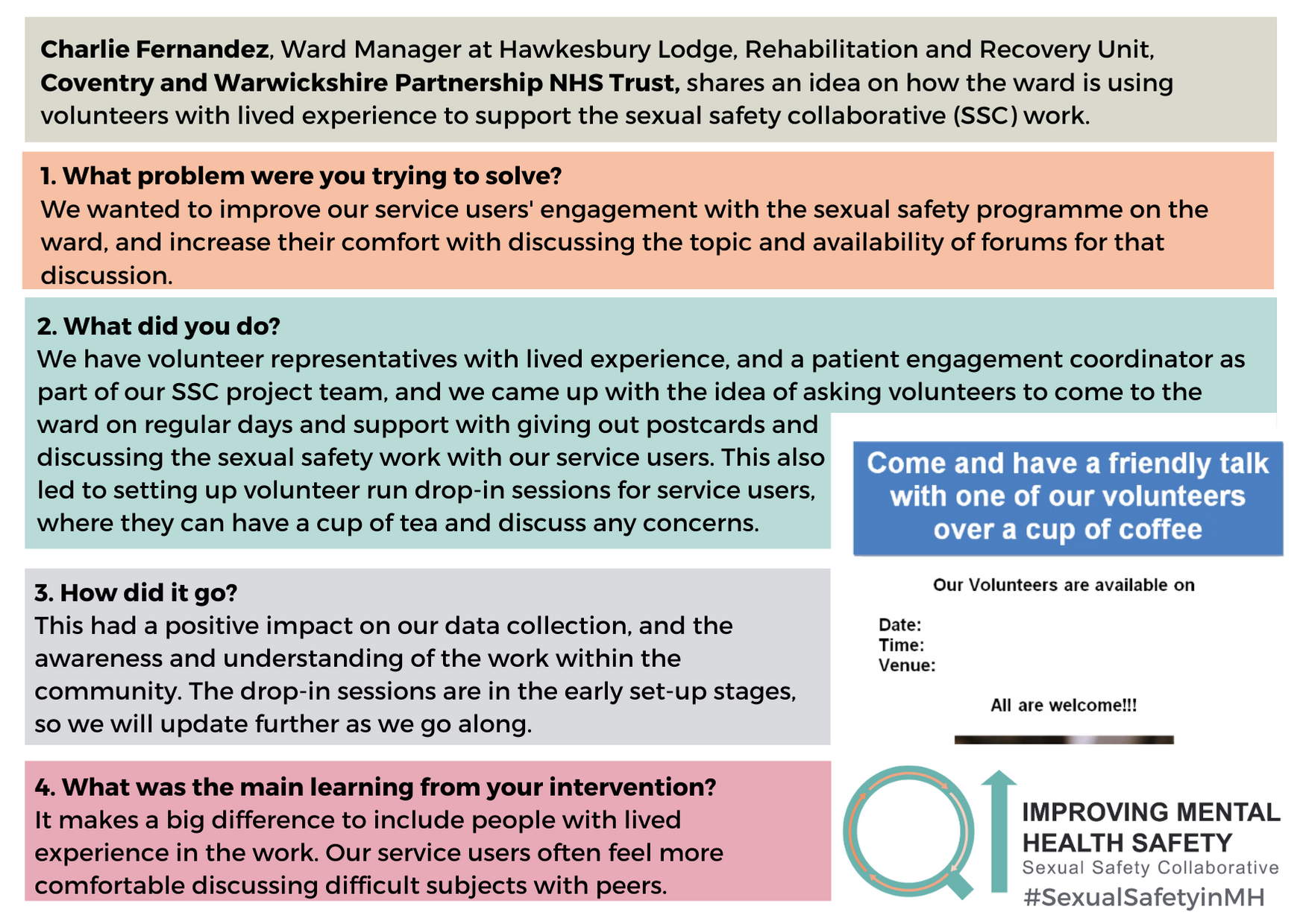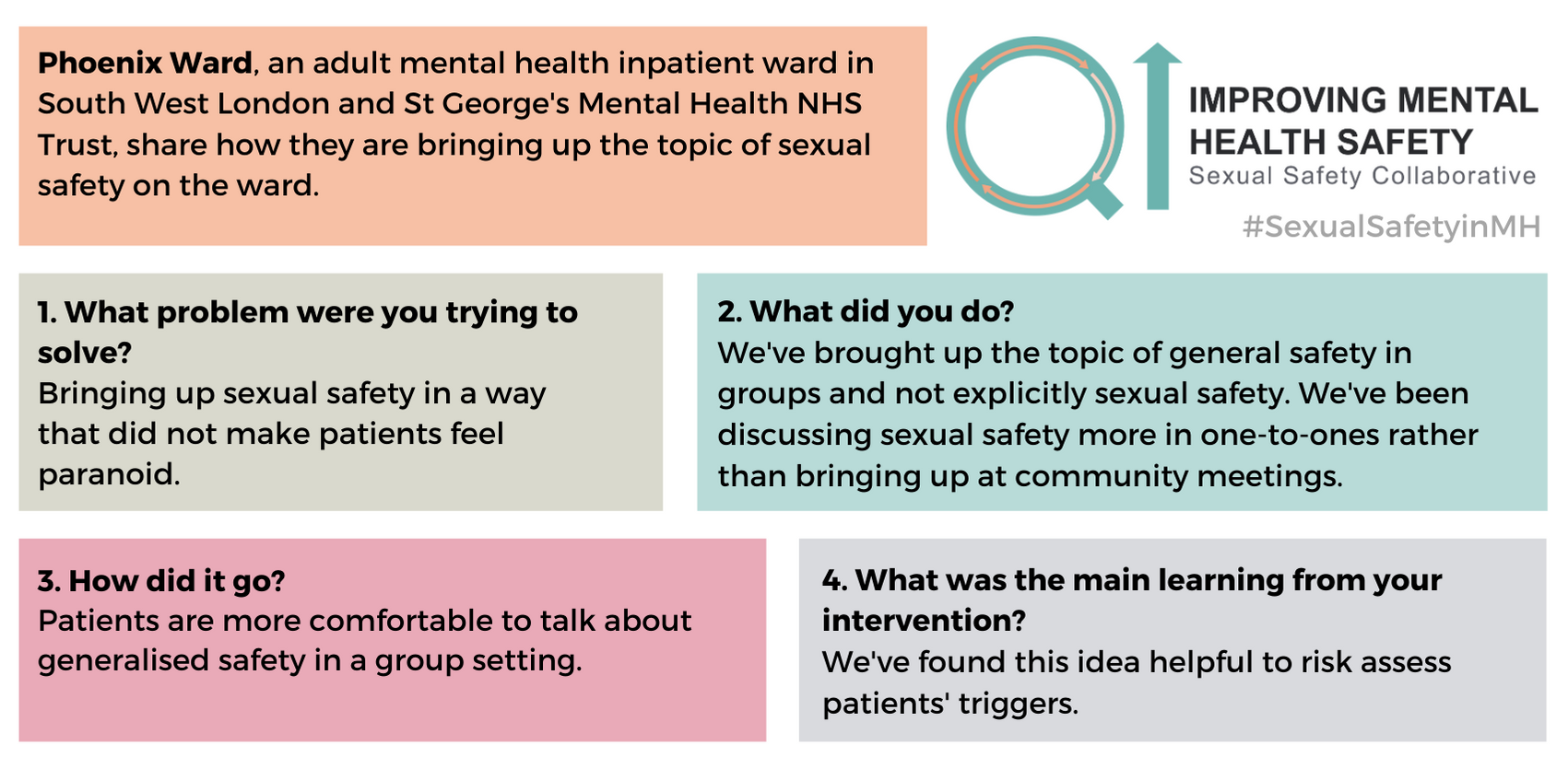 For any questions about the change ideas and resources, please contact one of the QI coaches or the safety improvement team at safetyimprovement@rcpsych.ac.uk.
