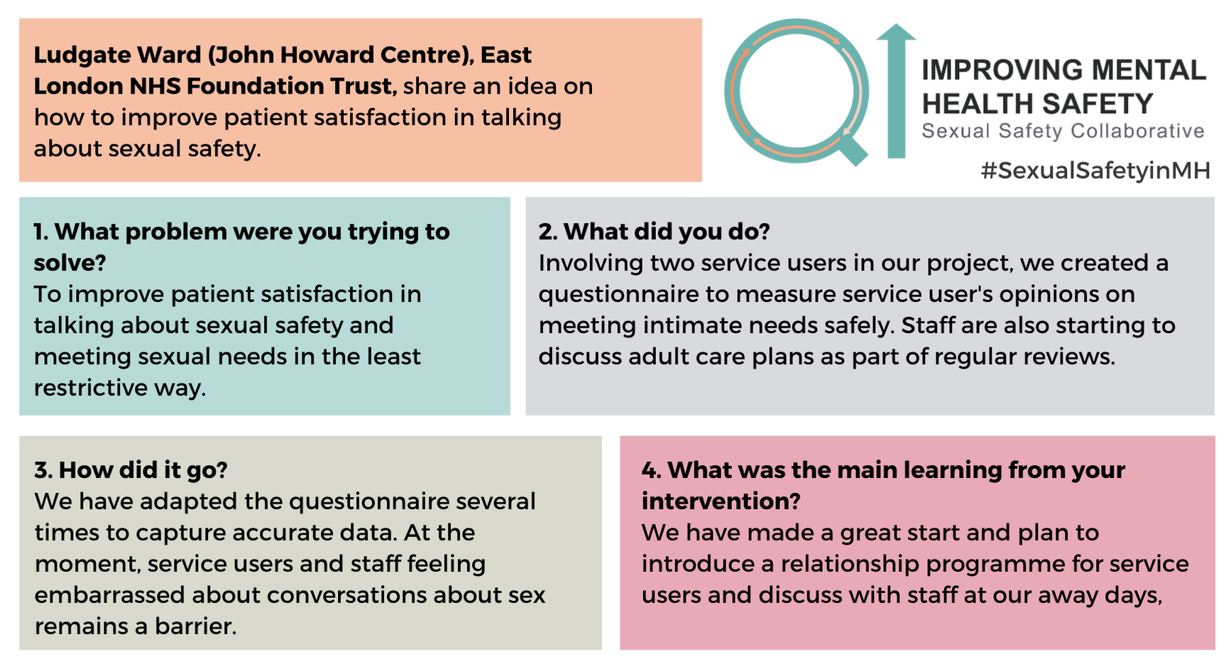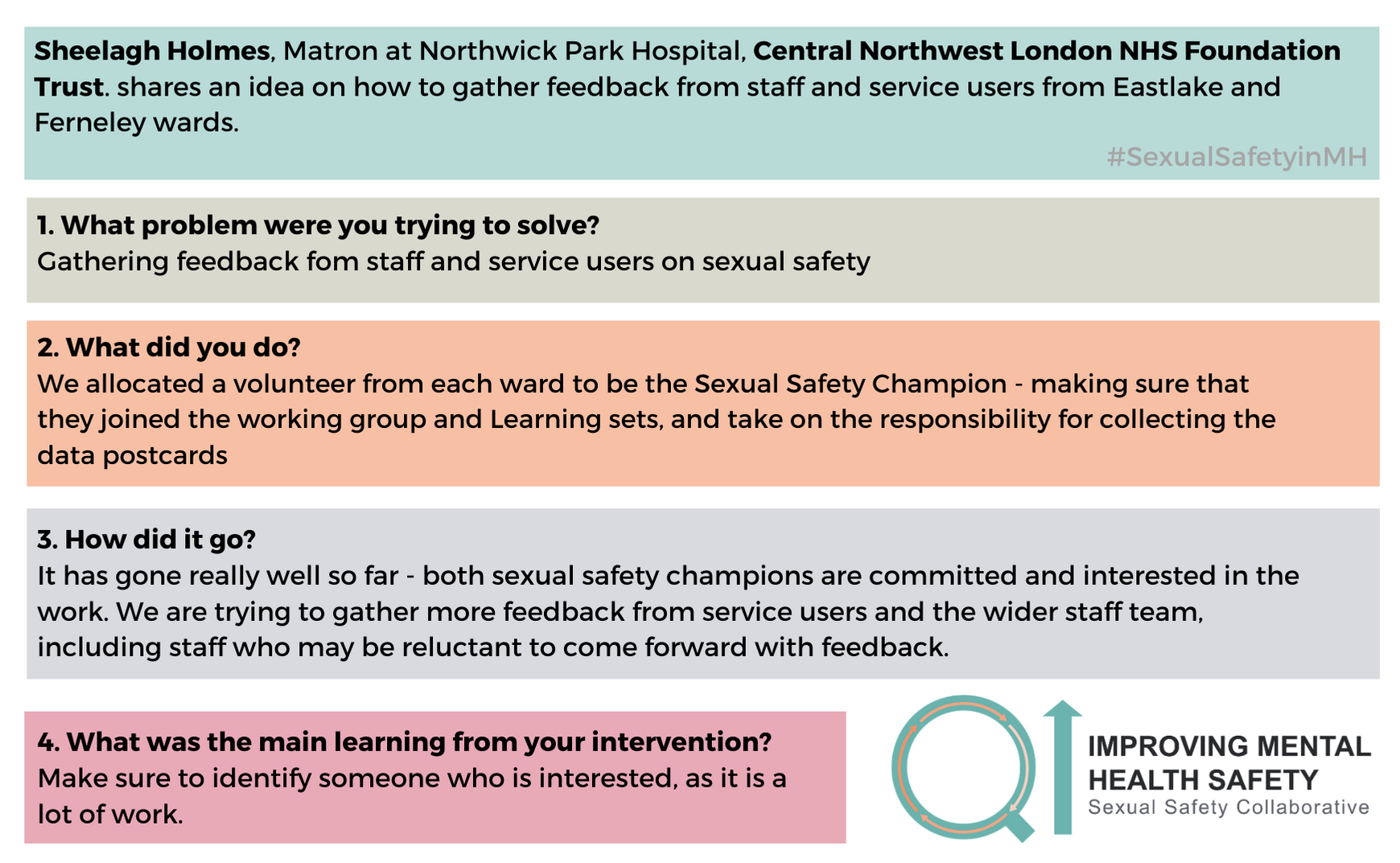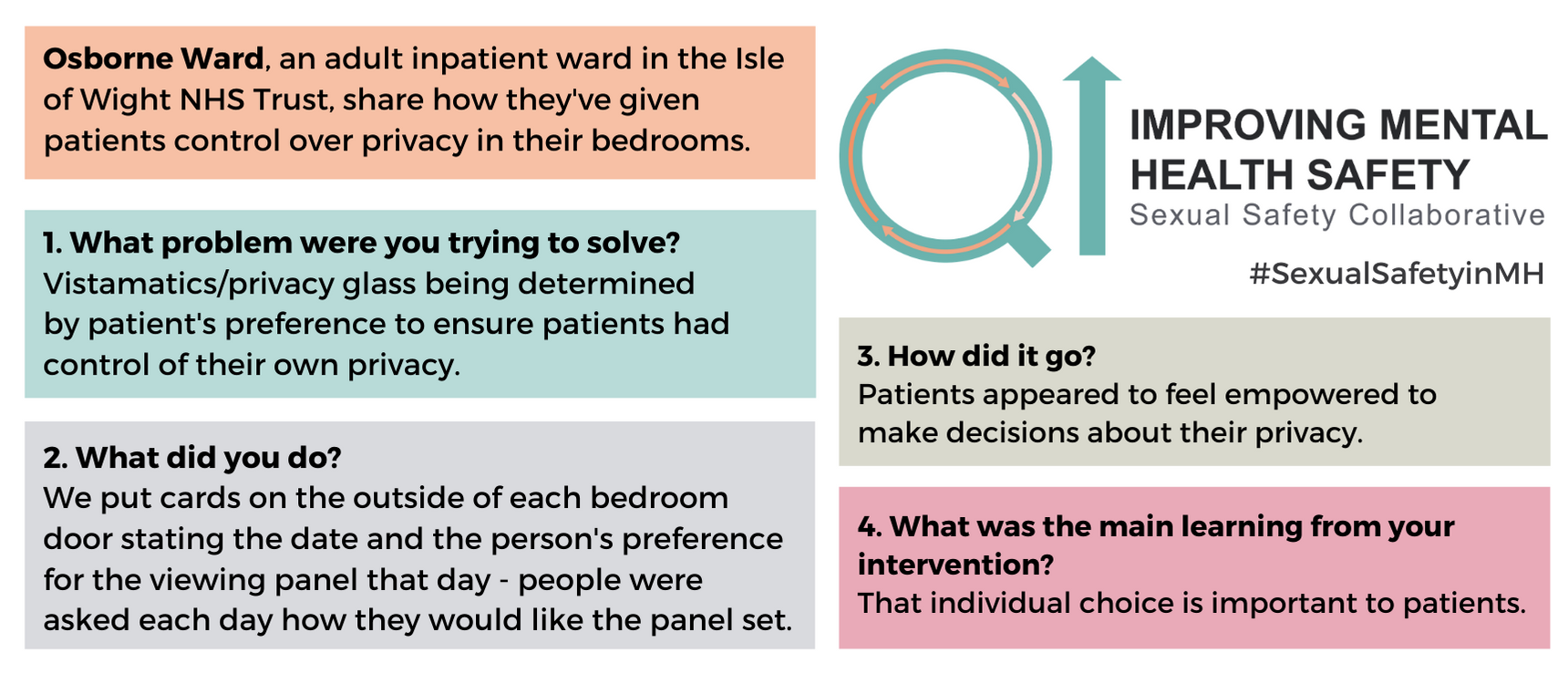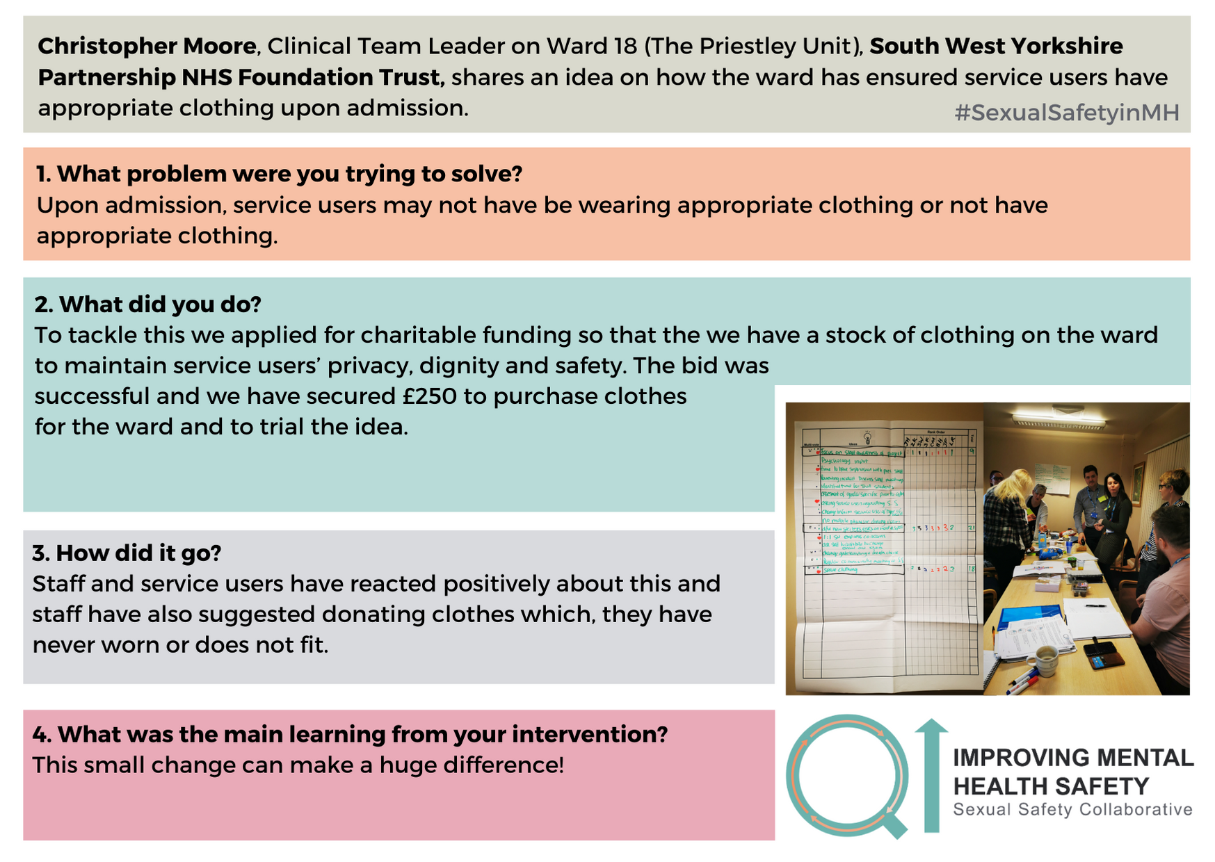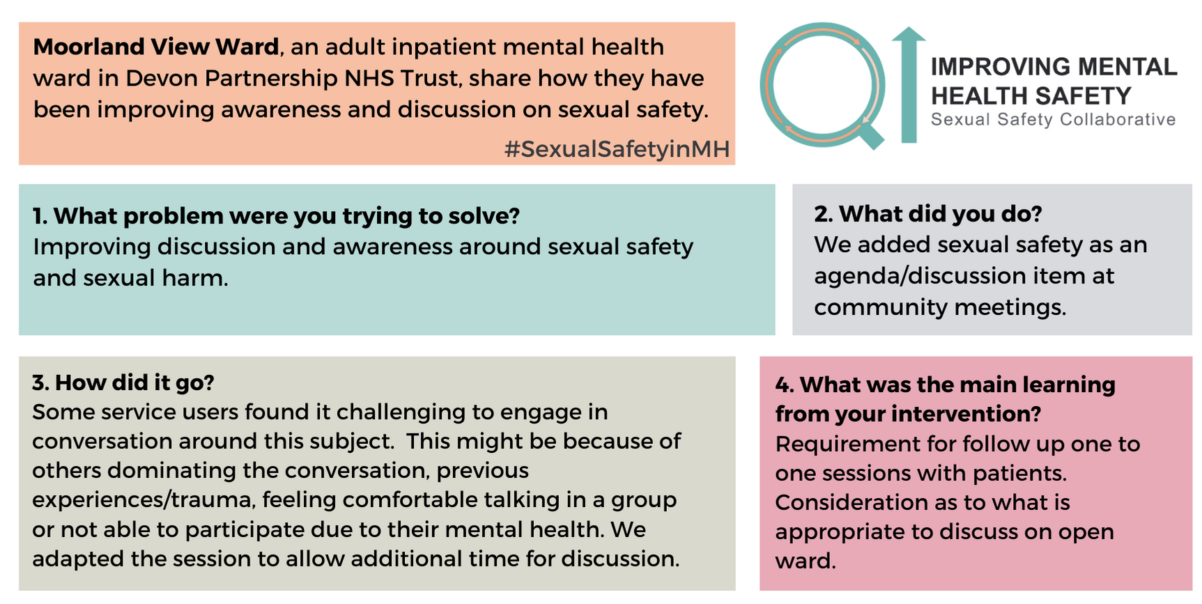 For any questions about the change ideas and resources, please contact one of the QI coaches or the safety improvement team at safetyimprovement@rcpsych.ac.uk.