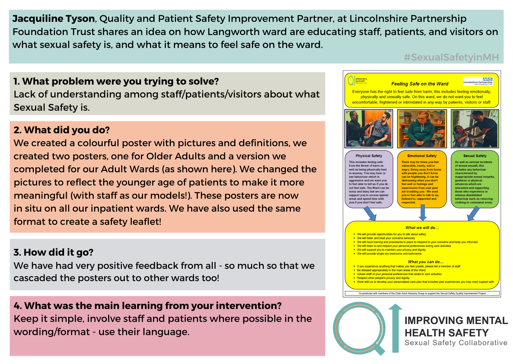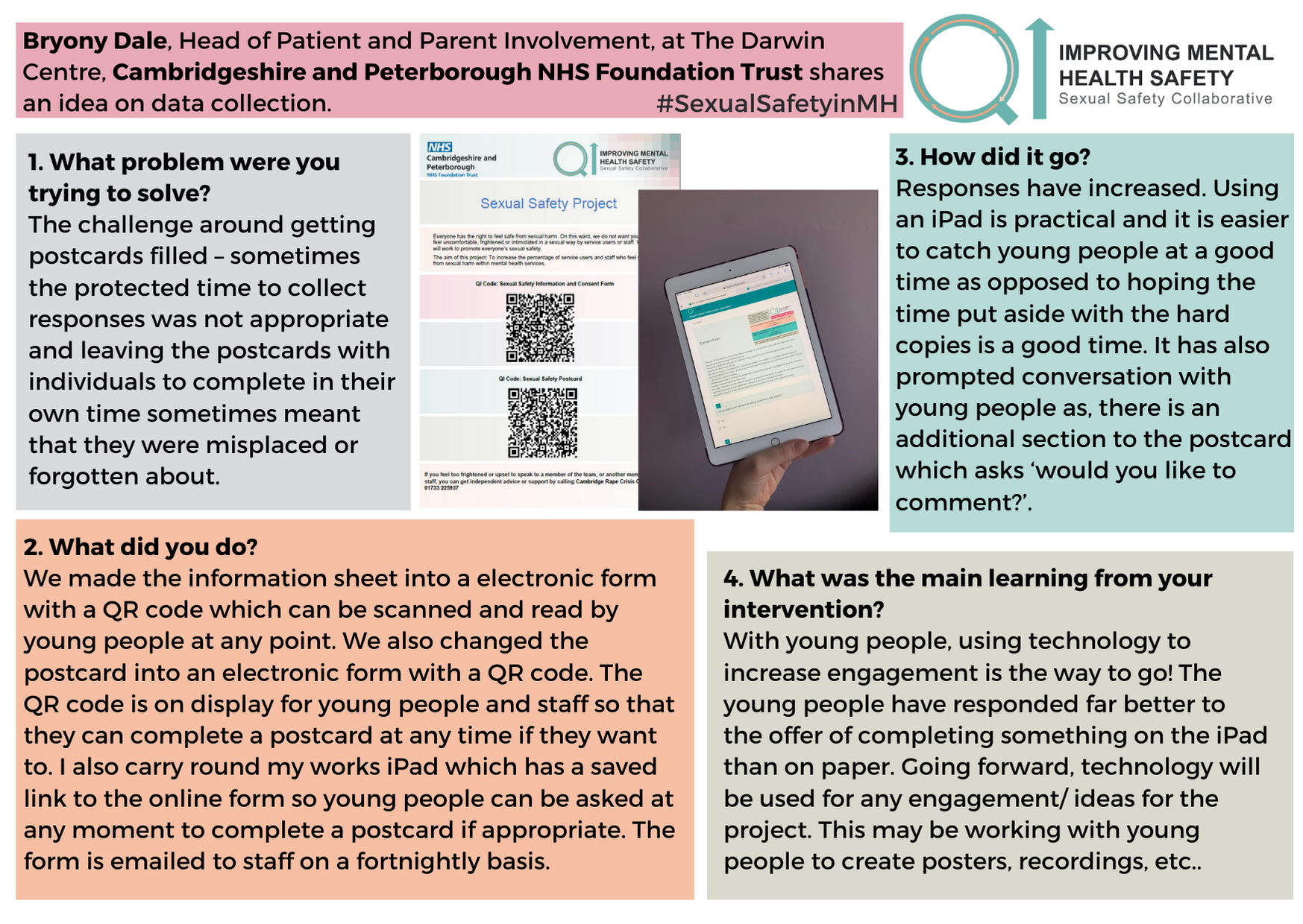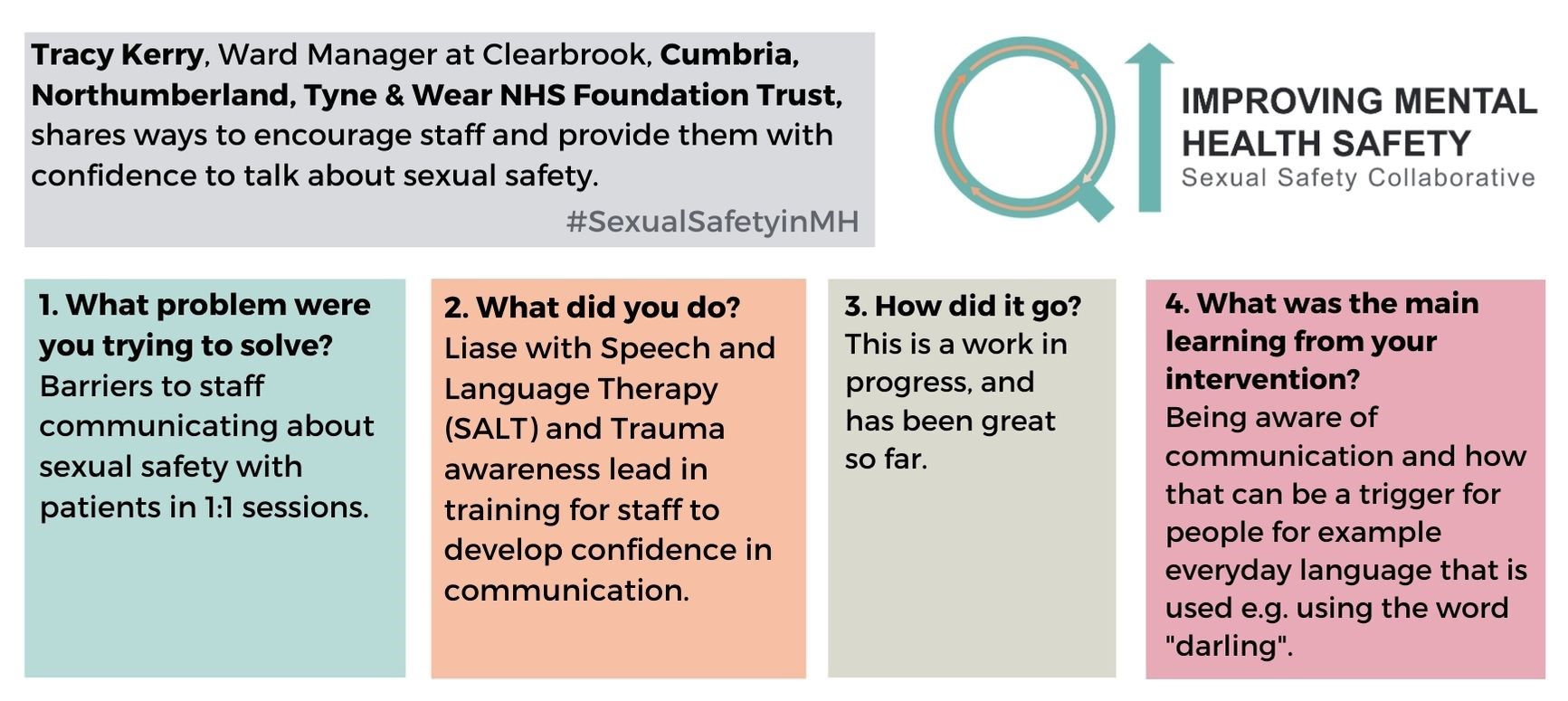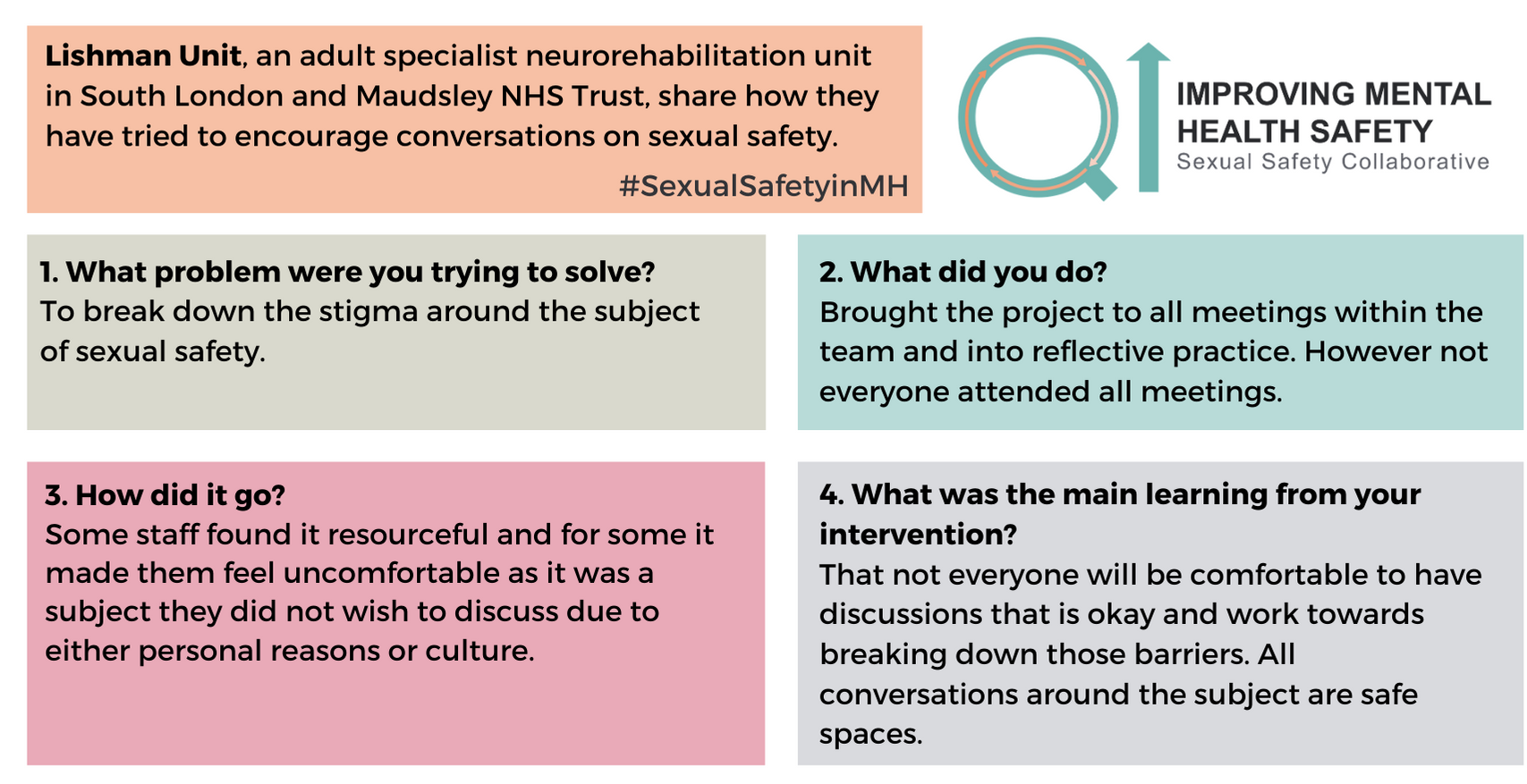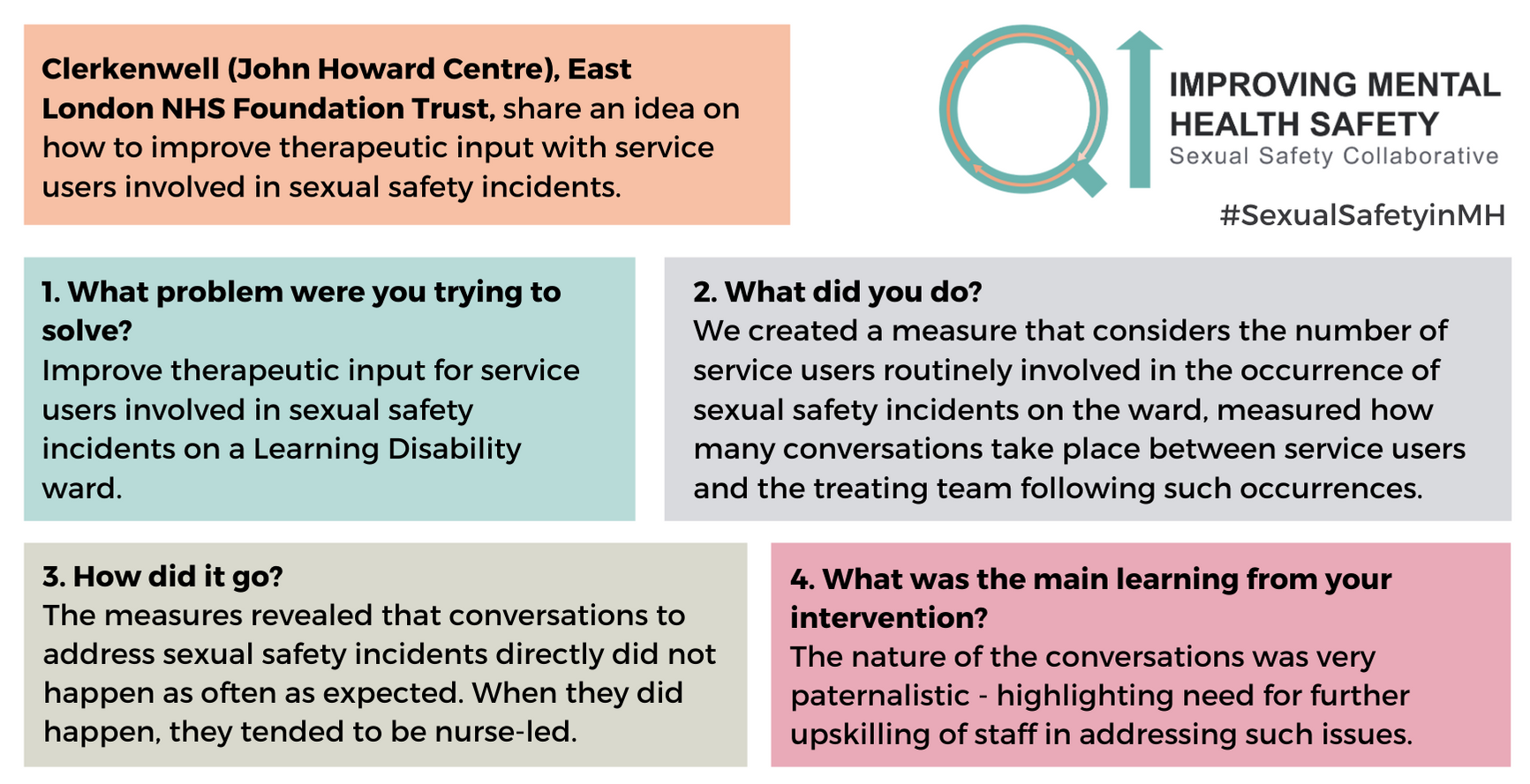For any questions about the change ideas and resources, please contact one of the QI coaches or the safety improvement team at safetyimprovement@rcpsych.ac.uk.