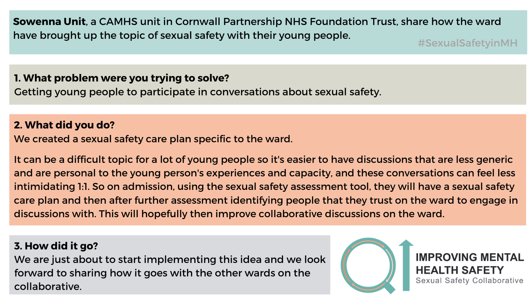 On this page you will find various change ideas that wards in the Sexual Safety Collaborative are testing.