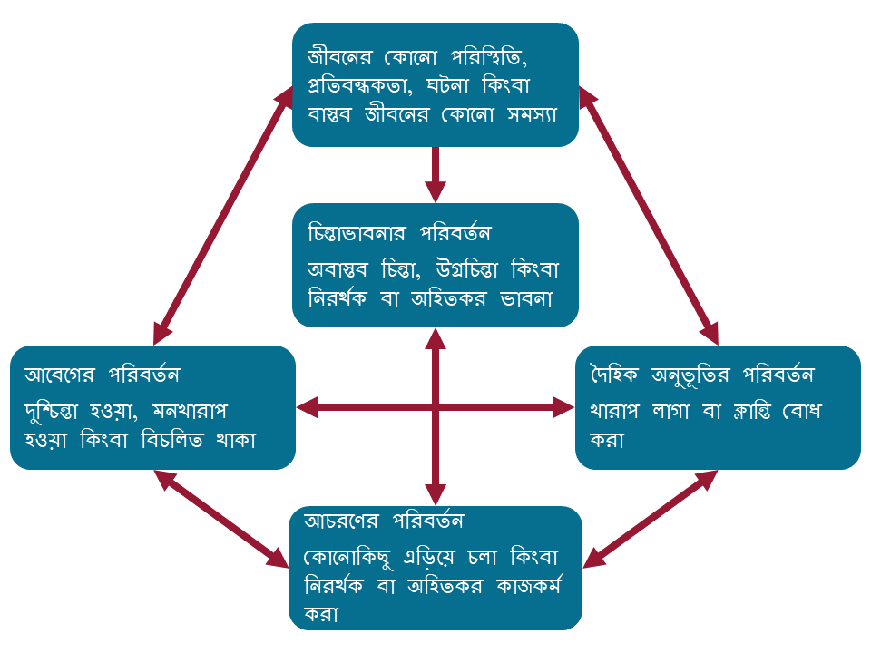 বিভিন্ন পরিস্থিতিতে আমরা যেভাবে চিন্তাভাবনা করি এবং আমাদের মধ্যে বিভিন্ন পরিস্থিতির যে প্রতিক্রিয়া হয় তার ফলে আমাদের আচরণ ও আবেগ কিভাবে প্রভাবিত হতে পারে তা এই রেখাচিত্রটিতে দেখা যাচ্ছে: