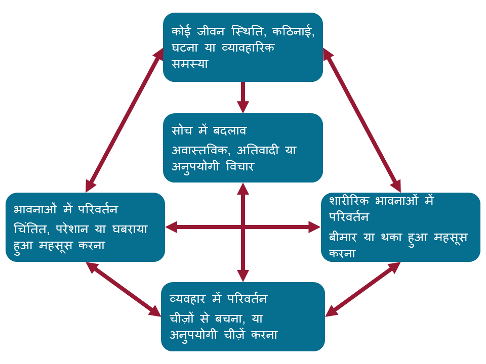 यह चित्र दिखाता है कि जिस तरह से हम स्थितियों के बारे में सोचते हैं और उस पर प्रतिक्रिया करते हैं वह हमारे व्यवहार और भावनाओं को कैसे प्रभावित कर सकता है: