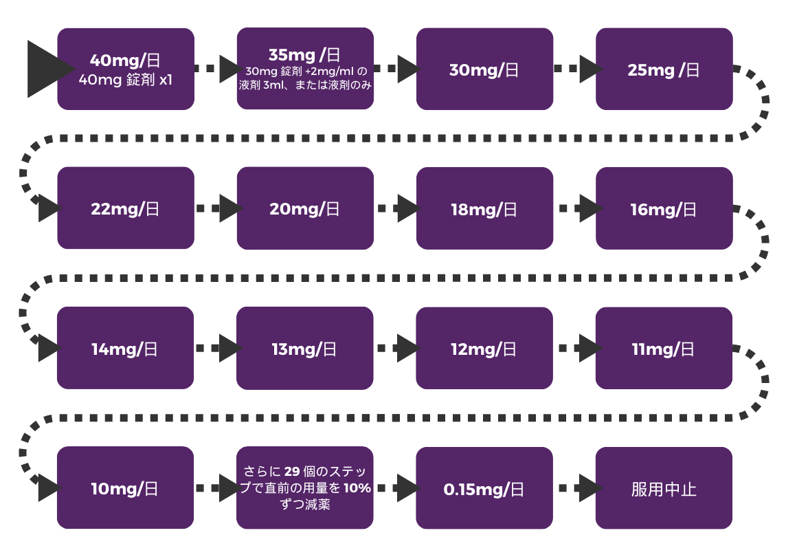 不快な症状がまったくなければ、現在の用量のさらに4分の1 (25%) または半分 (50%) の減薬を試します。さらに2週間から4週間空け、必要に応じて用量を減らして様子を見る期間を繰り返します。