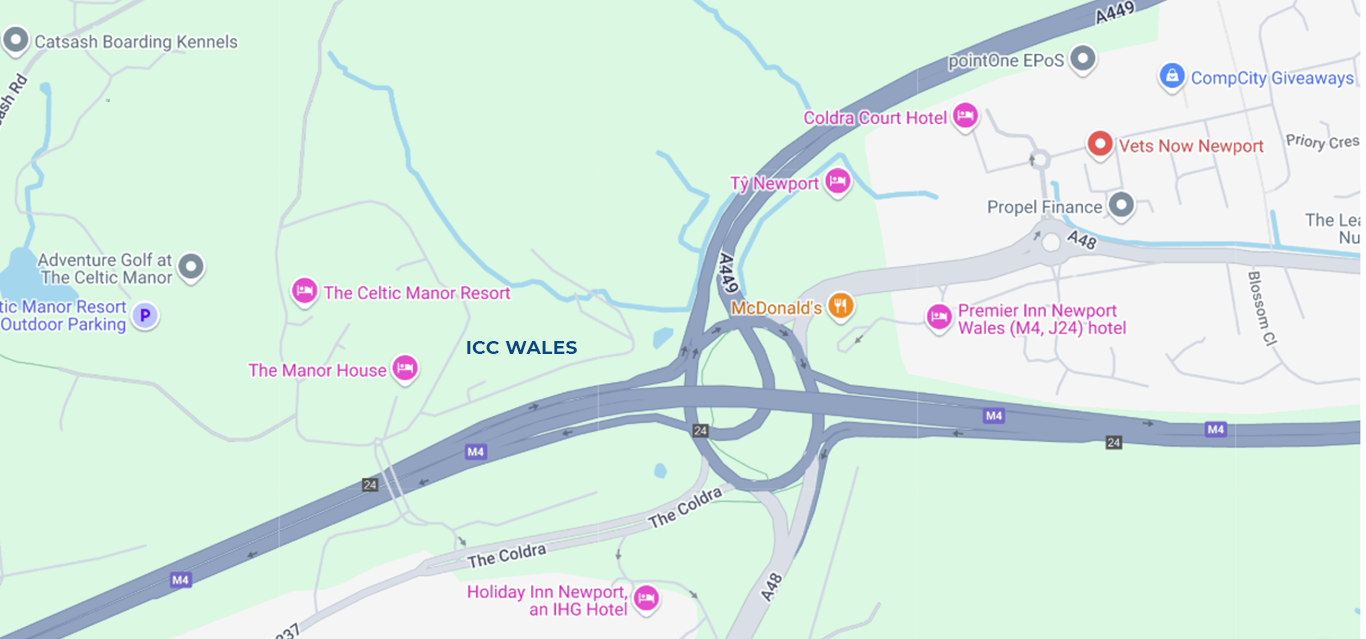In the map above you will see The Celtic Manor Resort and The Manor House. These two hotels are the ‘on site’ hotels. They are located within the same resort as the ICC Wales, although there is a short walk between them and the venue. Please also note that The Manor House doesn’t have a lift or step free access between the lobby and the rooms.
