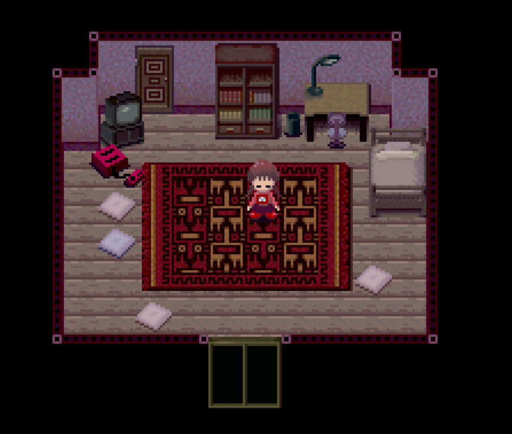 Exploration of Madotsuki’s room reveals little to do beyond playing a simple and repetitive mini game on a retro game console, interacting with a television which displays no channels, or saving progress in a diary. Given the lack of enjoyable options to pass the time, perhaps it is no surprise that going to bed offers an appealing alternative, which is when Madotsuki begins to dream. Each dream begins in Madotsuki’s apartment, which appears similar to its waking world equivalent, aside from one important aspect: Madotsuki is able to leave through the front door.